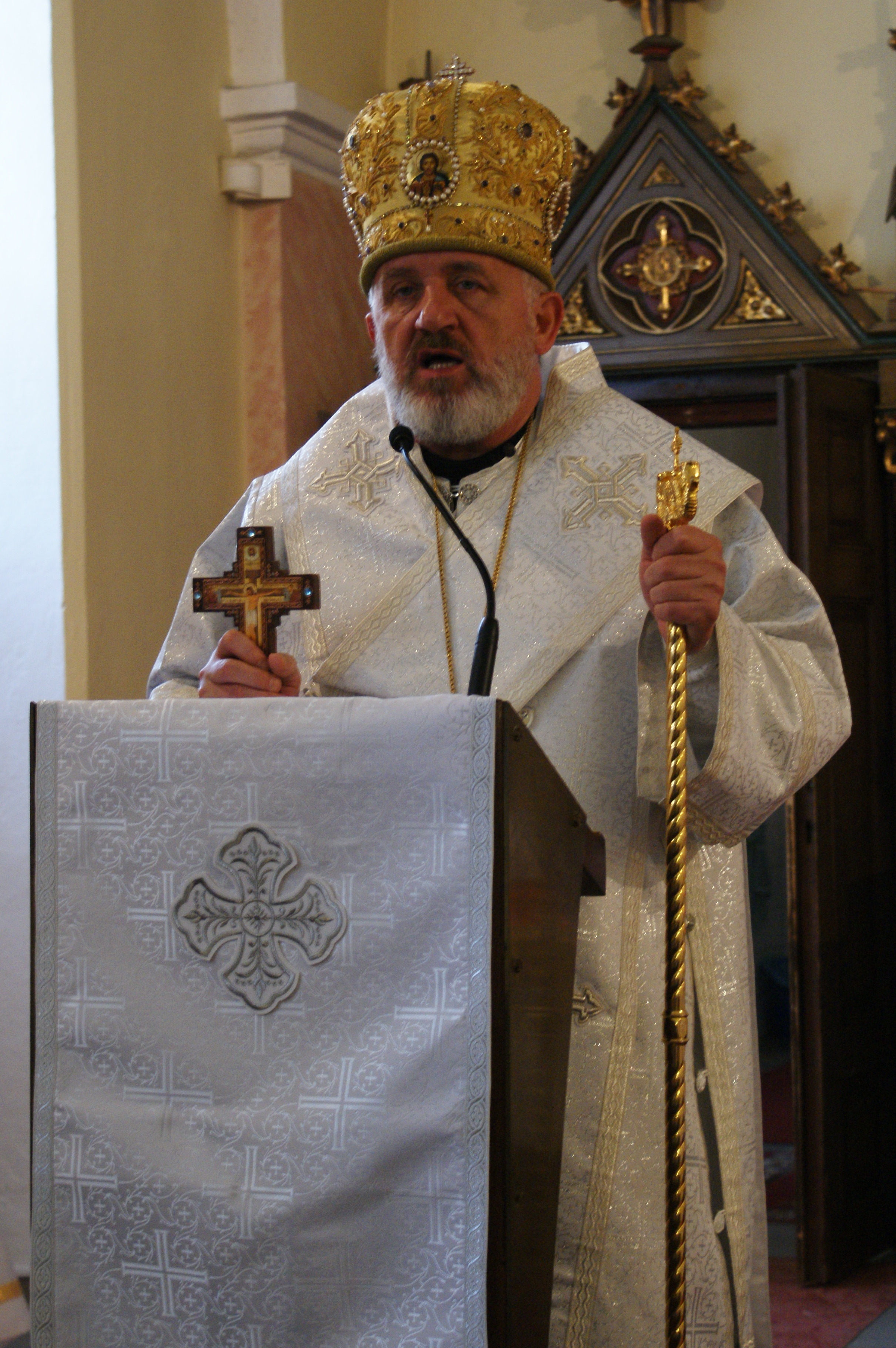 Vladyka v homílii vychádzal z nedeľného evanjelia o Samaritánke. Upriamil pozornosť na Ježišove slová, ktoré adresoval Samaritánke:  „…praví ctitelia sa budú klaňať Otcovi v Duchu a pravde.“/porov Jn 4,23/ Kristus týmito slovami chce povedať, že on neprichádza len kvôli židom, ale prichádza  z lásky k všetkým ľuďom, aj pohanom. Duch je Boh, pripomenul vladyka slová sv. apoštola Jána. Čiže sme pozvaní klaňať sa tomu, ktorý je vyšší od nás a má moc nás pozdvihnúť. Pokloniť sa Bohu znamená uznať ho za svojho Spasiteľa. A Boh nám posiela svojho Syna, aby skrze neho človek spoznal pravdu, ktorá je cez neho zjavená. Pravda je len jedna – na kríži. Zjavená láska ktorá bola opľutá, tŕním korunovaná, zabitá, ale na tretí deň vzkriesená. Ak sa človek otvorí tejto láske a pravde, je schopní dať odpoveď, ako dala Samaritánka, ktorá podľa tradície je stotožnená s mučenicou Svetlanou, či ako odpovedal biskup a mučeník Vasiľ, keď na Kristovu lásku, odpovedal obetou lásky – mučeníctvom.