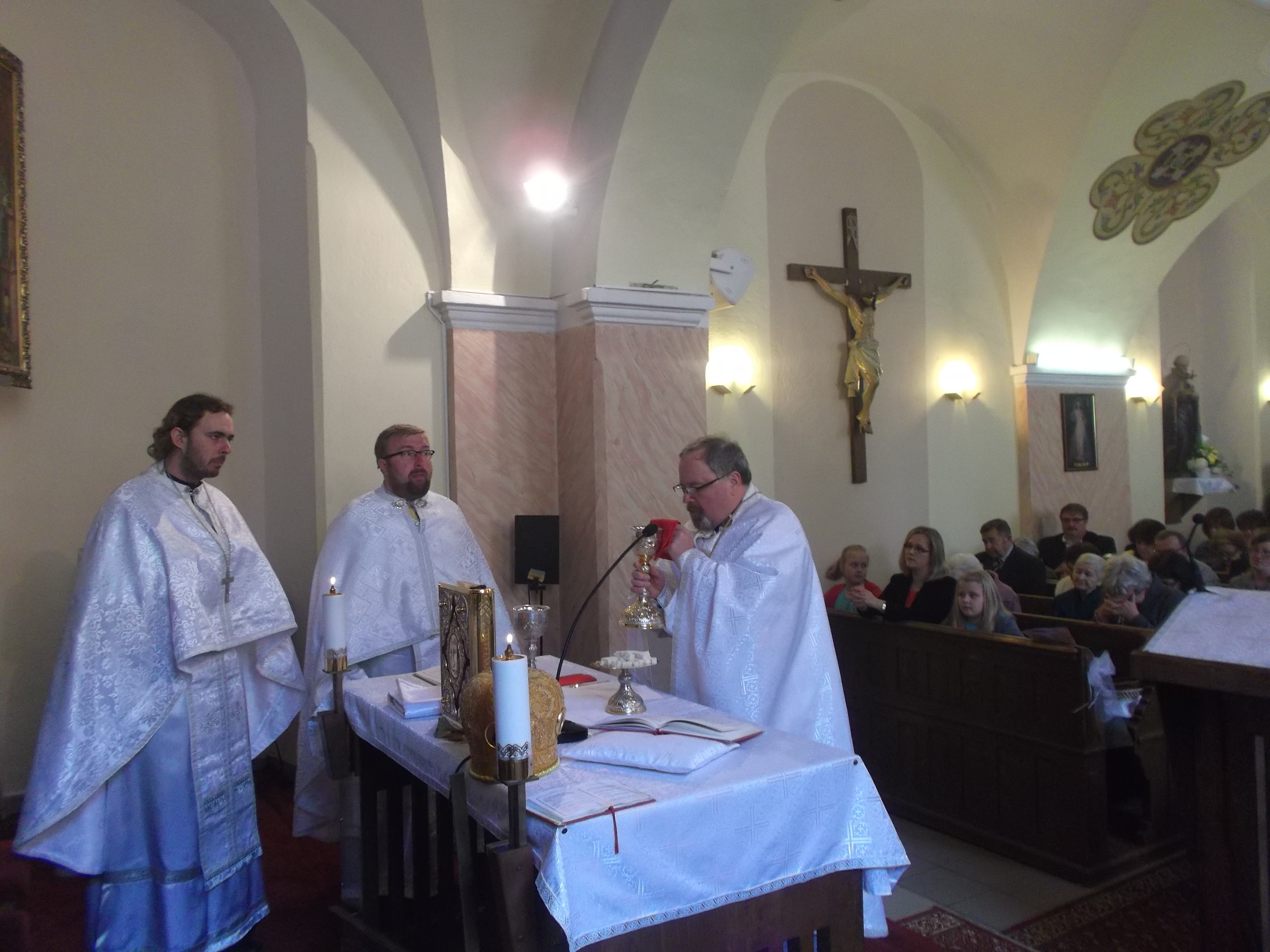 Do slávenia vstúpili v sobotu, modlitbou veľkej večierne  s požehnaním lítijných darov. Archijerejskej svätej liturgii predchádzal moleben k blahoslavenému Vasiľovi Hopkovi. Božskej liturgii predsedal vladyka Milan Lach SJ pomocný biskup Bratislavskej eparchii. Spolu s ním slávili: o. František Takáč, farár zo Šumiaca a domáci kňaz o. Ján Kovaľ.