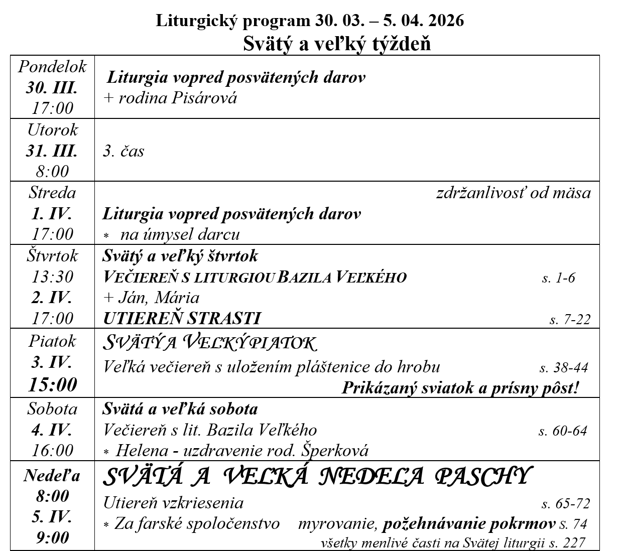 – Pri všetkých bohoslužbách sa vynecháva modlitba „Kráľu nebeský“, až do zoslania Svätého Ducha.– Svetlý pondelok je prikázaný sviatok. Sv. liturgia bude slávená v Cirkevnoslovanskom jazyku.